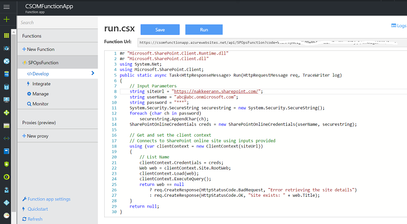 Go back to the trigger function created (SPOpsFunction). Copy and paste necessary CSOM code. In this sample, we are trying to find the site name of SharePoint Online site. Everything is hardcoded. The necessary site details and credentials are passed through CSOM code.