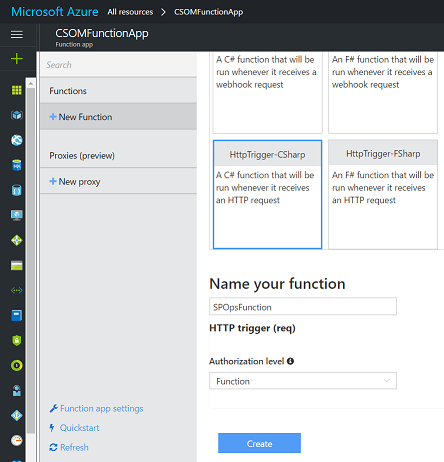 Under function app, create a new function, using HttpTrigger-CSharp.