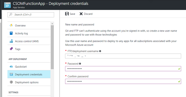 Since we are going to work with SharePoint CSOM code, the assembly files needs to be uploaded. For the same, set the deployment credentials. From function app settings, navigate to the app Service settings.