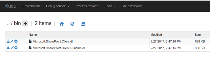 The assemble files should be uploaded to the custom function's bin folder. Navigate to the site -> wwwroot -> Custom function (In this case, it is SPOpsFunction). For SharePoint operations, Microsoft.SharePoint.Client.dll and Microsoft.SharePoint.Client.Runtime.dll files are required. These are the client side reference files, which are required for CSOM operations.