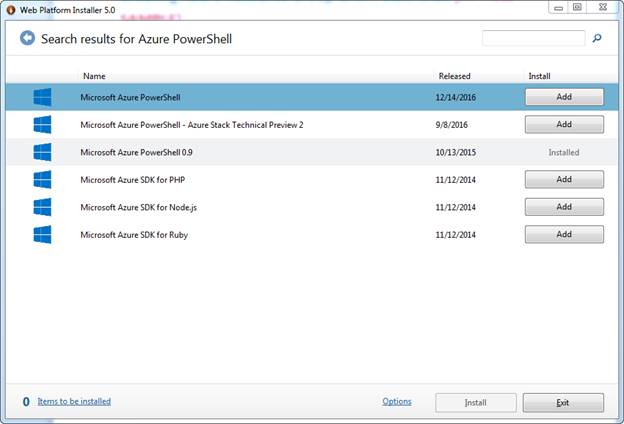 Before we dive into creating a resource group in Azure with the help of PowerShell, we need to install Azure PowerShell on your machine. Azure PowerShell can be installed on it from the PowerShell Gallery, using the Web Platform Installer (WebPI) or using the MSI file available from GitHub. You can do this by using “Microsoft Web Platform Installer” by searching on your computer. Open “Microsoft Web Platform Installer” with the administrative privileges and search for “Microsoft Azure PowerShell”. Find the appropriate entry, click on Add and then click Install.
