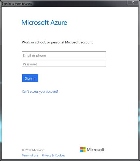 The cmdlet prompts you for the login credentials for your Azure account. After logging in, it downloads your account settings, so they are available to Azure PowerShell.