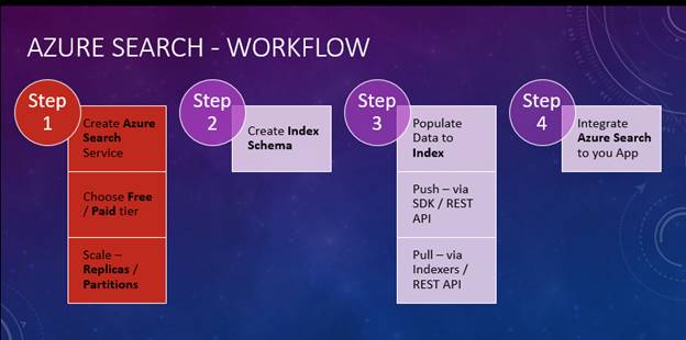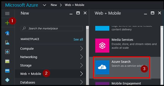 In this article, let’s start with creating the Azure Search Service. Please refer to the steps in the Azure Management portal, highlighted in the below diagram.