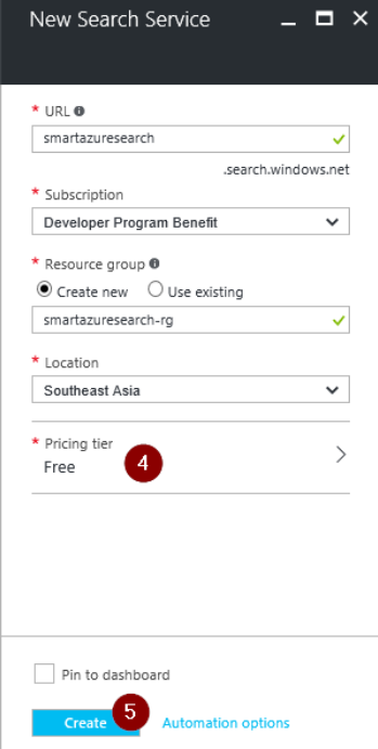 | Location | Select the Data Center location where you would like to have Azure provisioning the Search Service. Please make sure that all the applications which consume your Search Service are also hosted in the same location to avoid latency issues. |