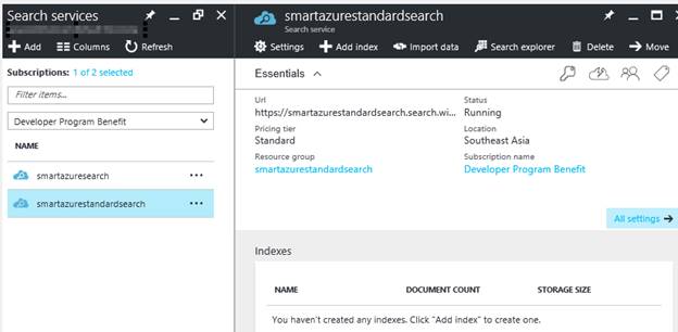 Once you are ready with all the details, click on "Create" in order to create the Azure Search Service. Given below is the screenshot of the service that we have created.