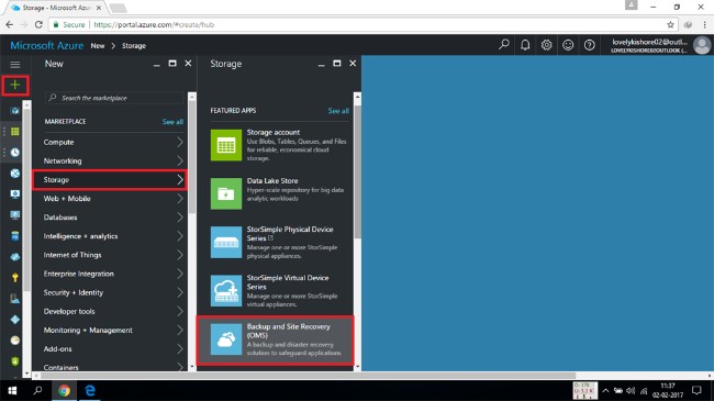 - Log into your portal and click on New >> Storage >> Backup and Site Recovery .