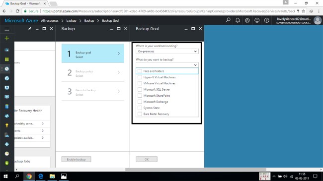 - This will now show you a window where you will be asked to select the data which you need to take backup of. You can choose either the VMs in Azure or you can even choose the local on-premises data.