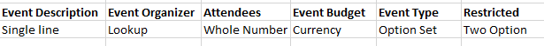 Let’s take an example. We have a custom entity event and we want to import the data to the following different data type fields:
