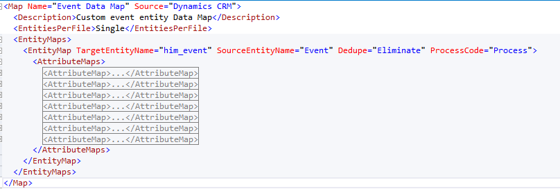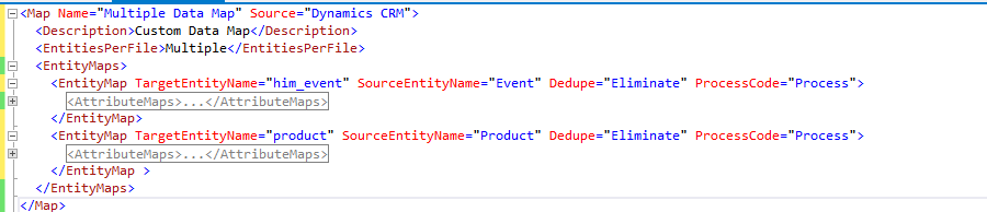CRM will validate the data map during import and will display if there is any mismatch in entity or field name. Similarly, we can create multiple entity data maps, using the following schema: