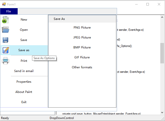 Actually, it is a TabControl, we all know. You can see that old Microsoft Office packages, like 2007,2010 etc. provided the RibbonBar with DropDownControl. Here, we already created our own DropDownControl. Now, it's the time to display DropDownControl with Tab. This can be achieved by setting first tab of TabControl (means index 0) to fixed for File option. Perform all the above actions except Step 5. Replace Step 5 to the following: