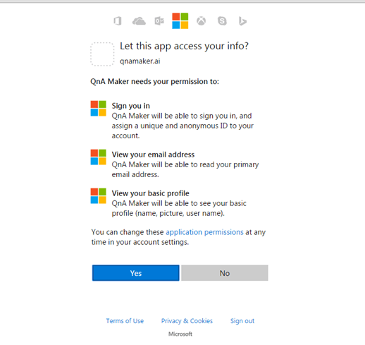 After successful login, QnA Maker will require some basic permissions to get started. Read those permission details carefully and click on Yes to proceed.