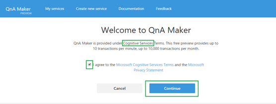 Now, QnA Maker will ask to agree with Microsoft Cognitive Terms and privacy statement, as QnA maker is provided under Cognitive Services terms. Check the ‘I agree.’ checkbox and hit on continue to proceed with.