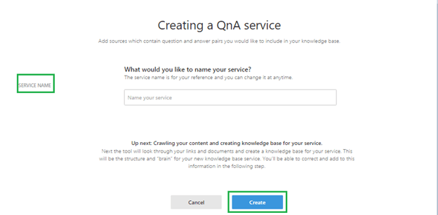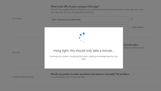 Hitting on ‘Create’ will lead to this neat message, saying QnA is extracting URLs for feeding data. Now, the time taken for this could vary with size and number of URLs you are entering.