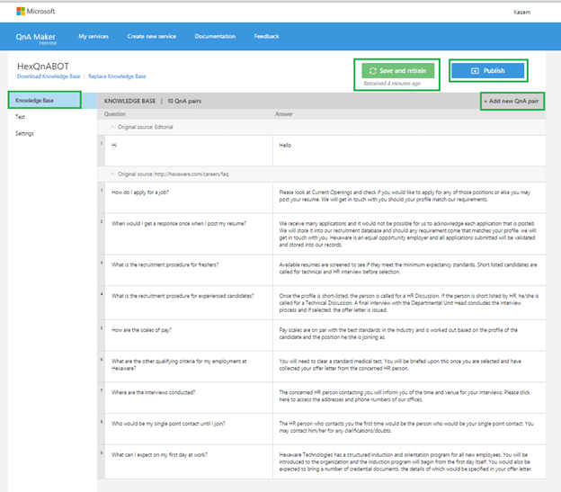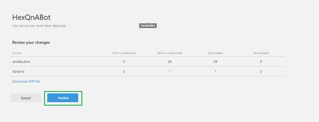 Now, once done with adding and modifying the knowledgebase, let's publish the same. Click on ‘Publish’ at top. This will lead to a summarize page where it will list total number of QnA added.
