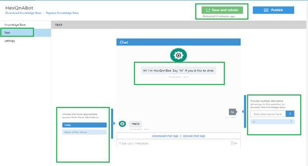 Very first QA is to start with greeting to Bot user. By default it has, ‘Hello’ as a response for ‘Hi’, you can modify with your desired response and click on ‘Save and retrain’ button to update the knowledge base. It has following options available,