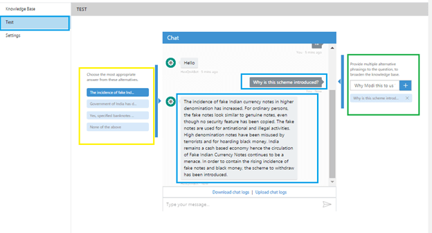 Once done with adding question set with any available method or combination of the same, lets test it how it will respond to given questions.