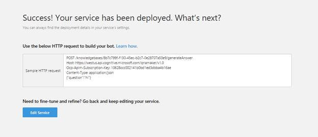 Success message with deployment will be displayed along with sample HTTP request URL, which you can use in your Bot application to communicate.