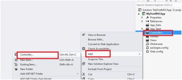 We get three folders named Model, View and controller. Since in MVC the user interacts with a controller so let us now add a controller to the application. Right Click on Controllers folder-> Go to Add-> Select Controllers.
