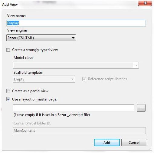 The following popup appears for entering the name of the view. The name shown here is the same name as that of the ActionResult. It is auto populated and needs to remain the same. We will use Razor Engine and since there are no models as of now to deal with so we will keep the checkbox unselected. Hit Add.