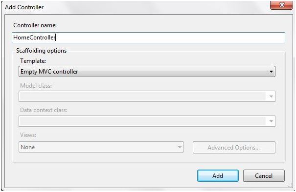 The following popup appears next. We will name our controller here. Name it “Home”. Controller keyword is auto appended. So it is recommended not to remove it from the textbox. We would be selecting Empty MVC controller as the template.