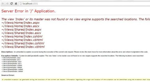 Oops we get an error instead of some meaningful message. Well this is because the default route specified in the route config is something else. We can find the route config file under App_Start folder.