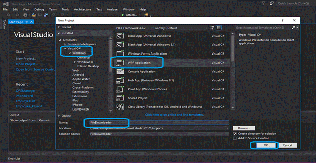 Here, you will be getting one pop-up as sown below from that select Visual C# -> Windows ->WPF Application template.