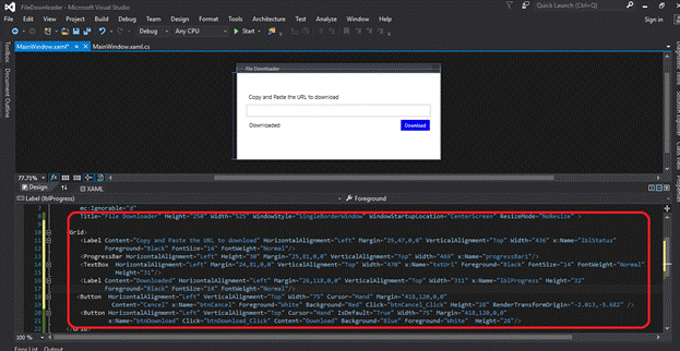 - Now, we will do the code for download button to download the file from the given URL in the textbox, as shown below.