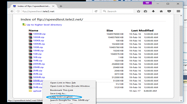 - For testing, we can use ftp://speedtest.tele2.net/ link, open this link and right click on any file, which you wanted to test and select copy link location, shown below.