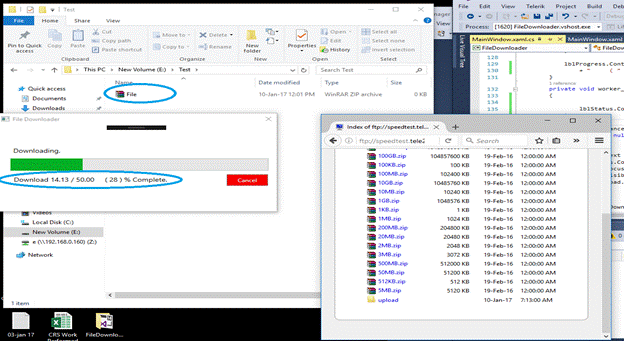 - Paste this link to our app File Downloader Textbox, followed by clicking download now and you can see the progress without interruption or hanging, as shown below. In Destination file, I have hardcoded as E:\Test\File.zip