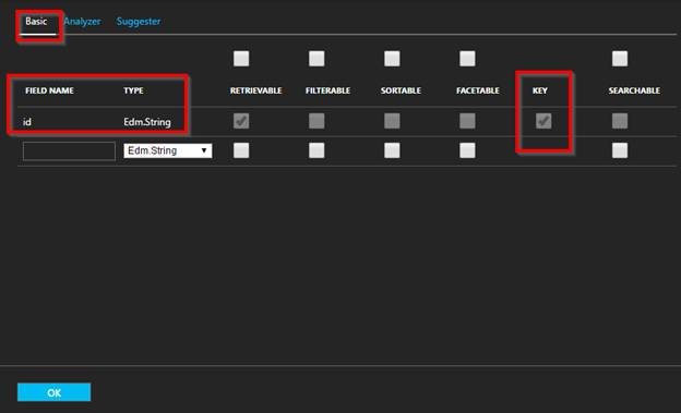 - Basic is the default tab that gets opened. There you define the Index Schema. This is similar to creating a database table with different columns and constraints.