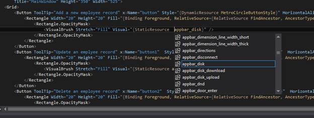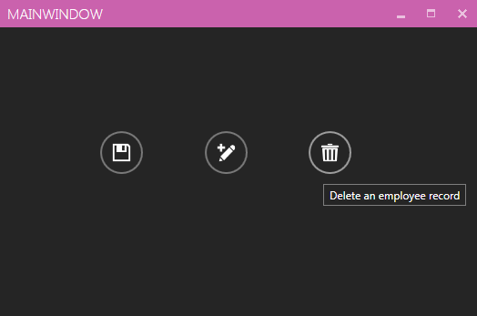 - </Button> Button ToolTip="Delete an employee record" x:Name="button2" Style="{Dynamic Resource MetroCircleButtonStyle}" HorizontalAlignment="Left" Height="55" Margin="335,110,0,0" VerticalAlignment="Top" Width="55">