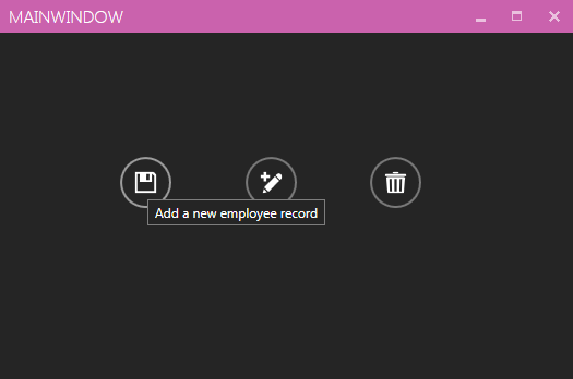 - <Button ToolTip="Add a new employee record" x:Name="button" Style="{DynamicResource MetroCircleButtonStyle}" HorizontalAlignment="Left" Height="55" Margin="106,110,0,0" VerticalAlignment="Top" Width="55" Click="button_Click">