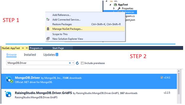 - Right click on reference to get NuGet Package Manager to get the driver  	to get connectivity with MongoDB. In "Browse", search for MongoDB.Driver  	driver and install it. For this example, I am using version 2.4.