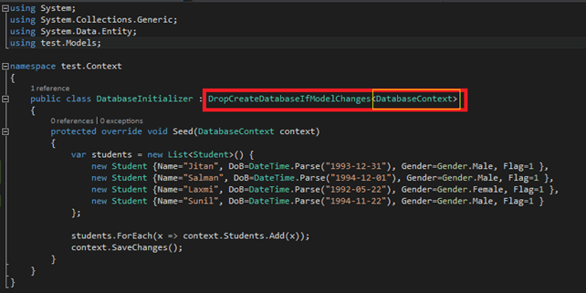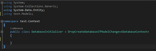 The databaseInitializer class inherits (red bordered) one of the three classes offered by entity framework to create database.