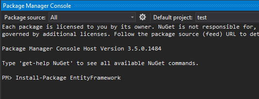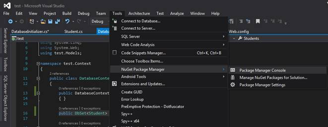 Now, start your Package Manager Console by going into Tools -> NuGet Package Manager -> Package Manager Console.