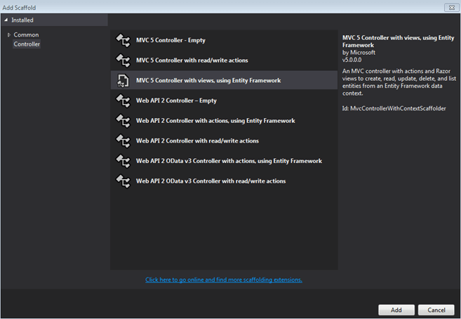 Once you add this Controller, Scaffold templates will create all read-write action with views, using Entity Framework.