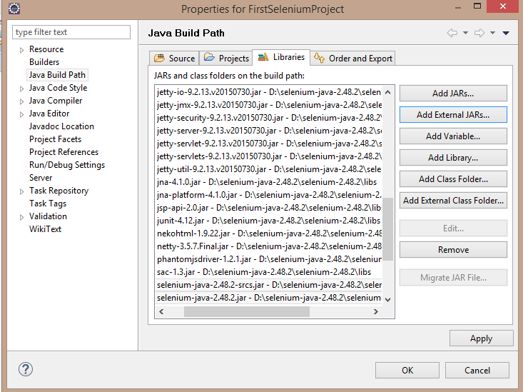 Step 4: Now add all selenium library jar files by right click on the project name and select Configure build path from Build Path option.