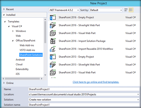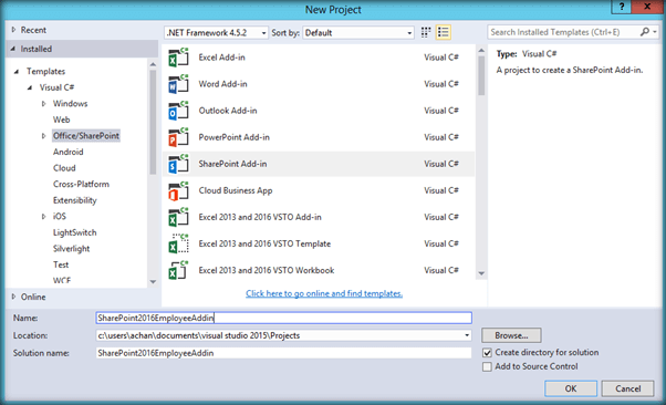 In order to ensure that we have the required templates spin up Visual Studio. From Office/SharePoint section, check if the ‘Web Add-ins’ and ‘SharePoint Solutions’ templates are available. If it is not present, we will have to install Office developer tools available here, so as to add the SharePoint 2016 templates along with Office Templates as part of Visual Studio.