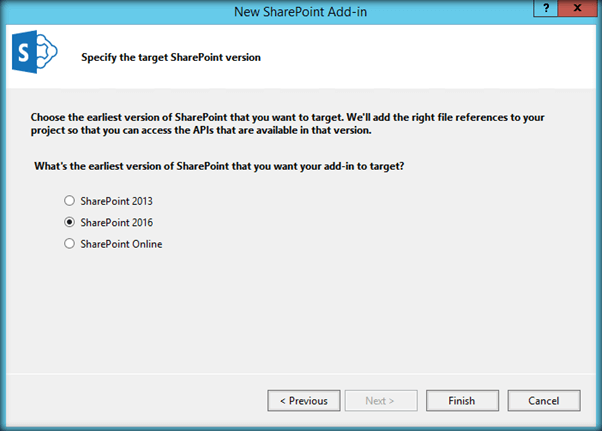 Specify the version of SharePoint that will be used for deployment which is SharePoint 2016 in our case.