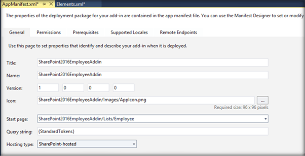 Now, we have to update the app manifest file and set the start page to the list, that we are going to deploy. Unless ‘Start Page’ is set, on clicking the deployed app, it won’t navigate to the desired list. Specify the list object as ‘SolutionName/Lists/ListName’. Here, SolutionName and ListName are the respective names that can be found in the solution structure.