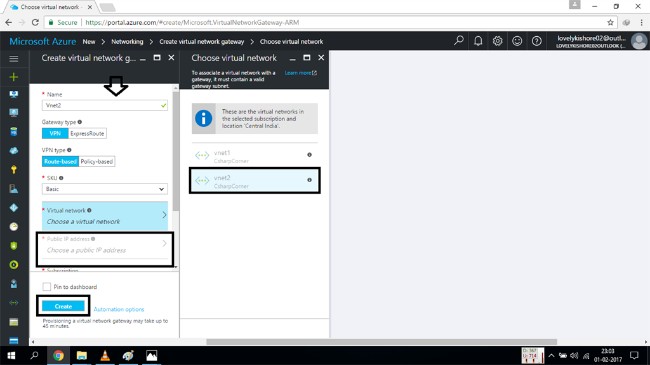 Once you finish this, choose the public IP address you like to assign to your VNET and then click on the "Create" button.