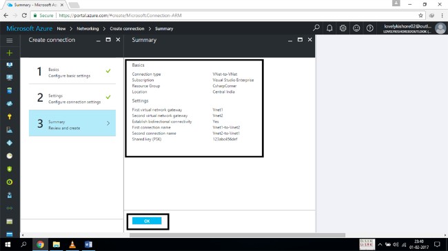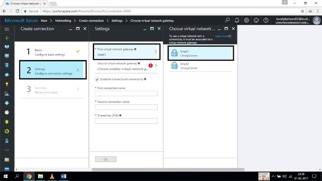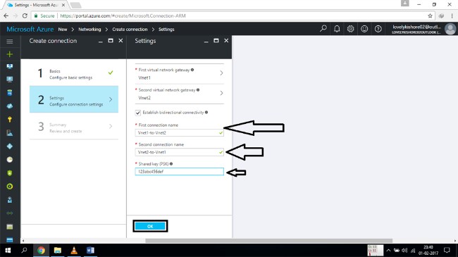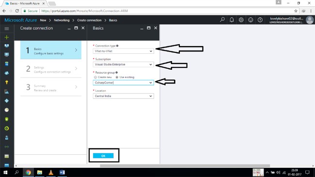 Click on the basic configuration settings and select the Vnet to Vnet option. Enter the required details and then click on the "OK" button.
