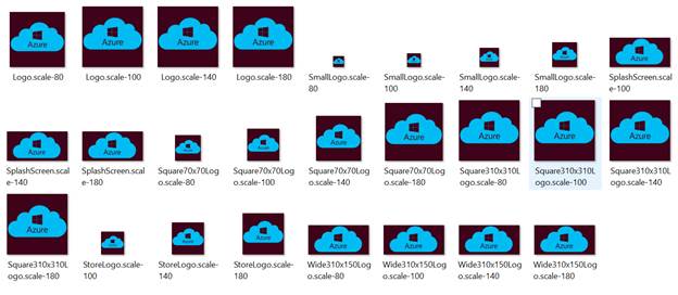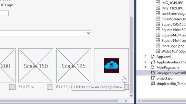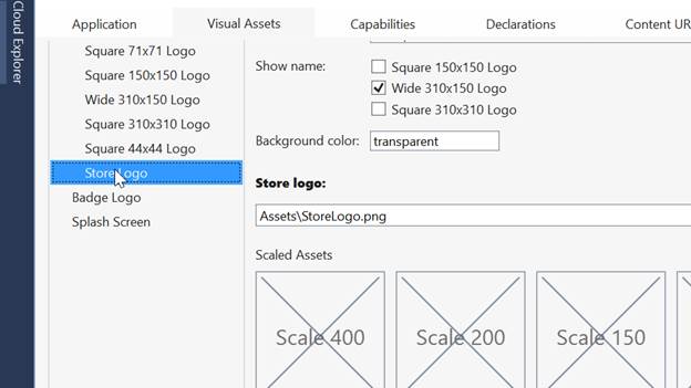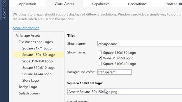 Windows Store apps should support display of the different resolutions. Windows provides a simple way to do this, via resource loading. This selection lists all the assets, which are used in the manifest.