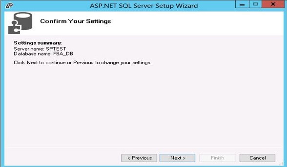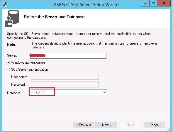 Select Windows Authentication [this is for SQL Server] -> Database:FBA_DB -> Finish.