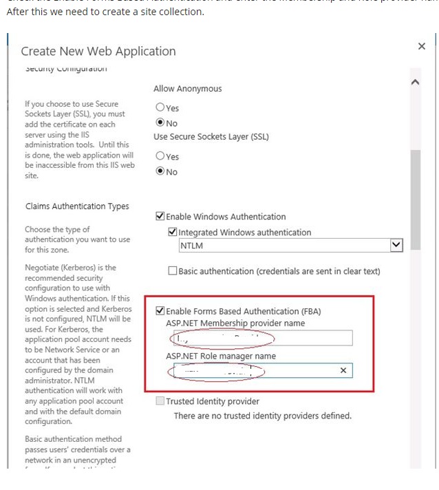 - CBA Types-> Check FBA-> Select ASP.NET membership Provider="FBASqlMembershipProvider" Role Provider="FBASqlRoleProvider"