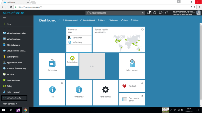 To create a virtual network, you need to have an azure account with a subscription. You can get a free subscription for Azure with a trial offer. You can find it in the official Azure site. So if you have a subscription, simply login into the portal and your portal will be displayed somewhat like this.