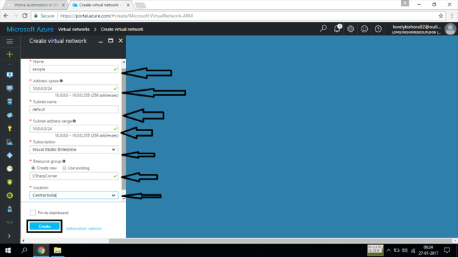 Once you click on it, you will be asked to enter credentials like name of the network, total number of address spaces required, Subnet name, Subnet addressing range resource group and the network location. Remember that the virtual networks are mainly used for configuring different data centers which will be found in different locations. Once you enter all the credentials, click on the