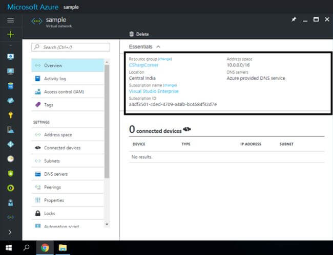 When the creation of the virtual network completes, you can make use of it for the virtual configuration of the virtual machines and other cloud services in different locations. When you click on the created virtual network you can find something like this which is indicated in the screenshot below. These details are to show you how many address spaces and subnets you have created and how many devices are connected to this network.