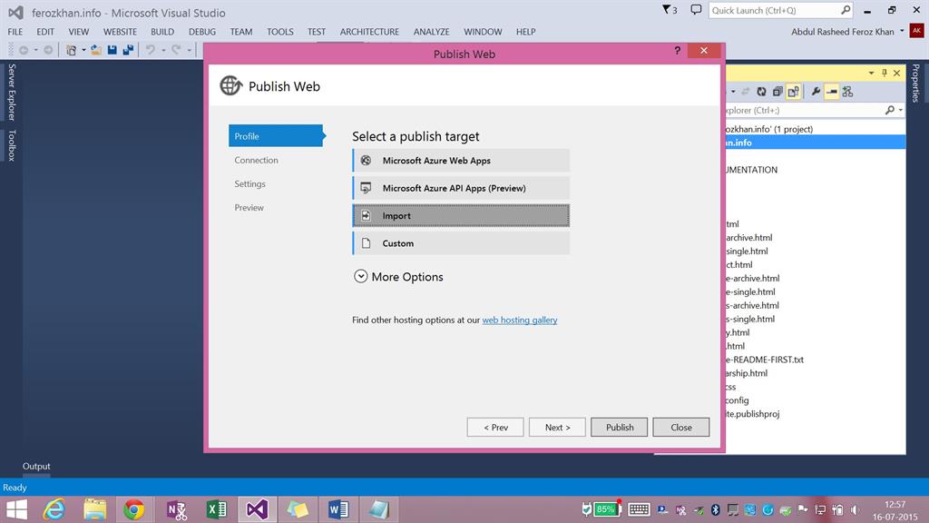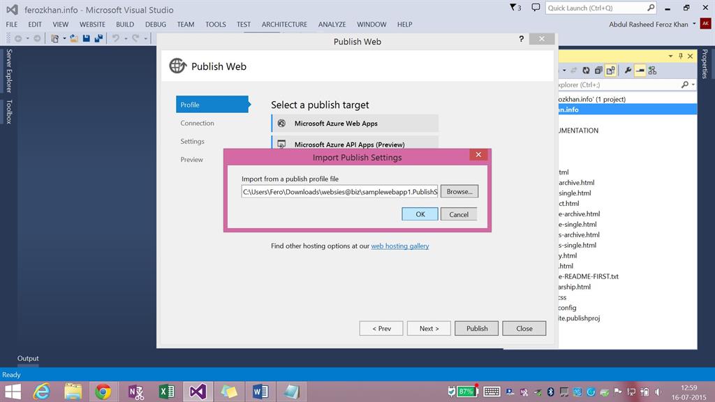 Step 6: Move to Visual Studio, you will be having this pop-up, click on import and locate the publishprofile information,