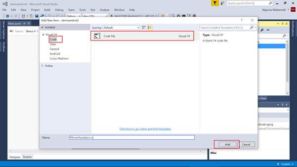 Under New Item dialog box, select Visual C# - Code and name the code as PhoneTranslator.cs. We will be adding some code here, translating phone numbers from alphanumeric to numeric.